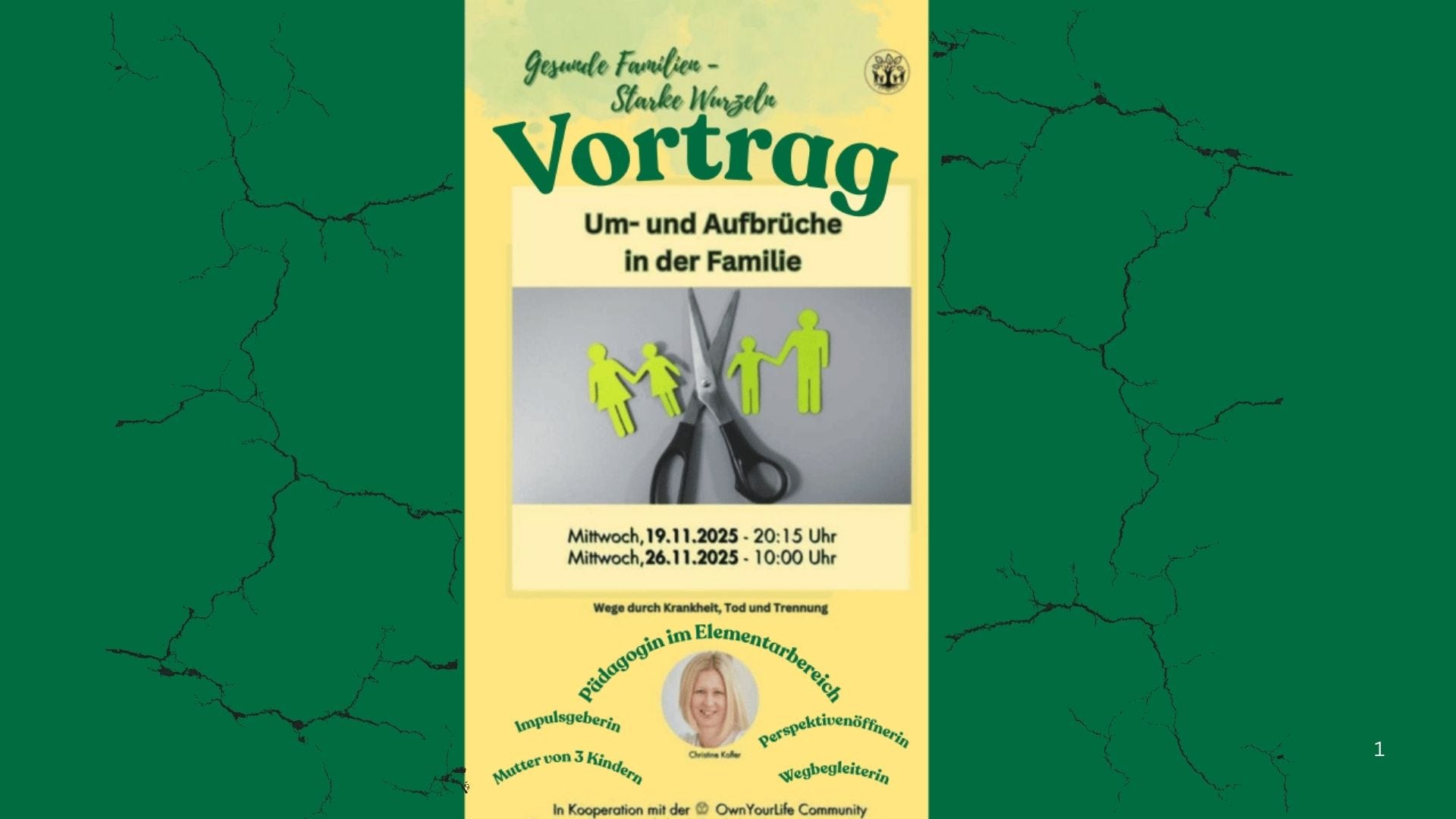 „Um und Aufbrüche“ Der Vortrag behandelt, wie Eltern mit Herausforderungen wie Trennung, Scheidung, Krankheit oder dem Verlust eines Elternteils umgehen können. Er zeigt, wie Selbstfürsorge und die Rolle als verlässliche Bezugsperson in Einklang gebracht werden. In belastenden Zeiten gilt es, Raum für eigene Trauer zuzulassen, ohne die Kinder mit Sorgen zu belasten. Unterstützung durch Familie und Freunde ist dabei wichtig. Kinder sollen nicht Verantwortung für die Stabilität der Eltern übernehmen, sondern durch ehrliche, altersgerechte Kommunikation und feste Rituale Sicherheit erfahren. So können Eltern gestärkt aus Krisen hervorgehen.